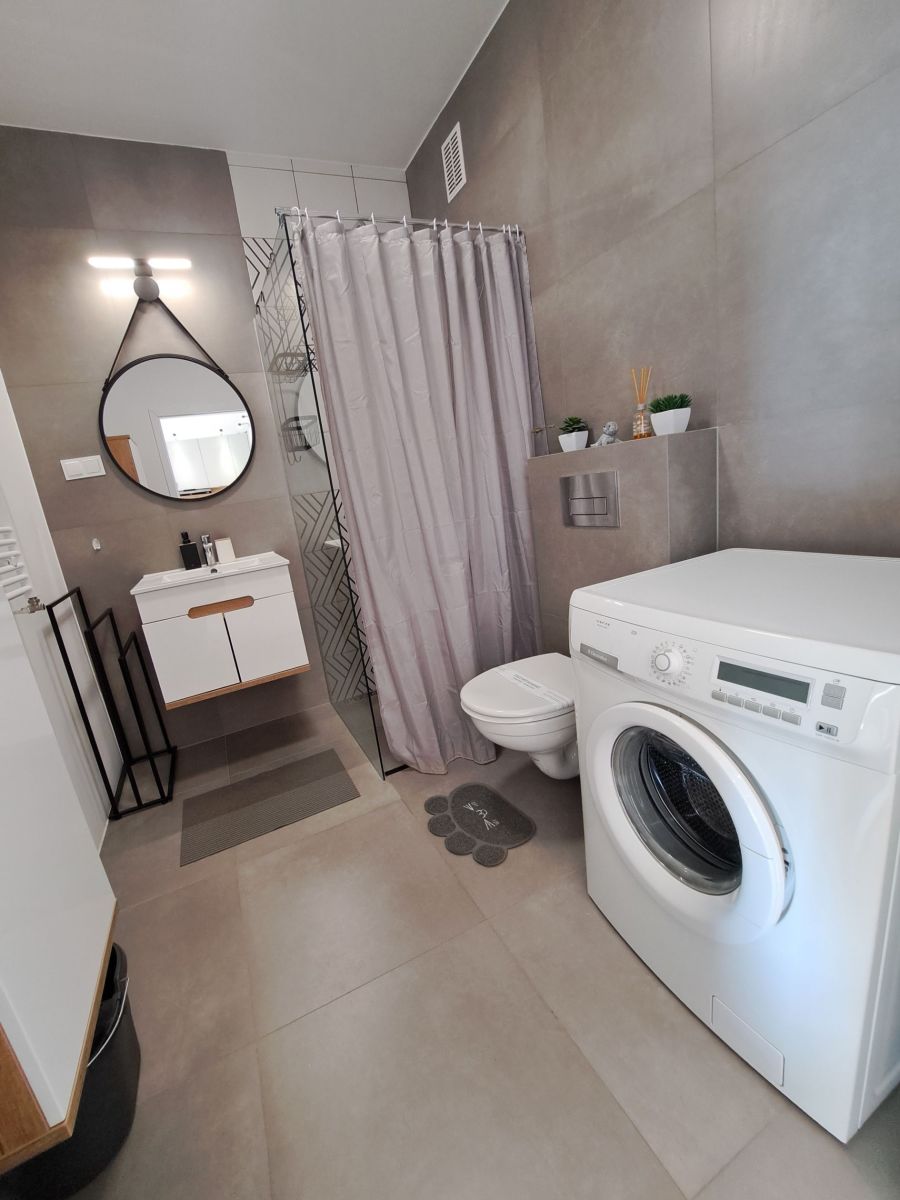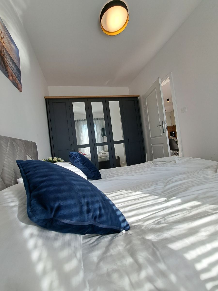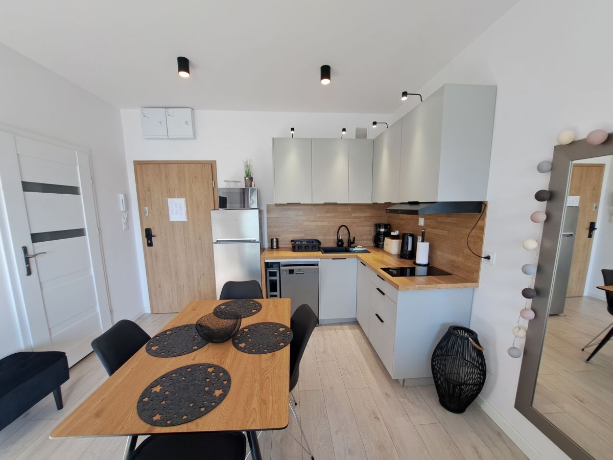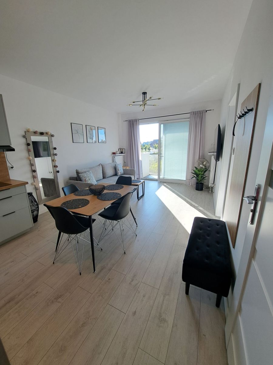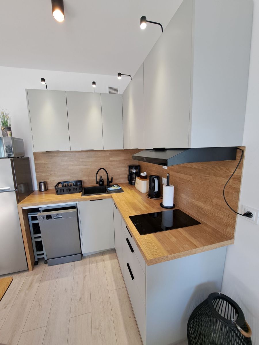 Duże okna wychodzą na stronę zachodnią, co zapewnia naturalne doświetlenie wnętrz i przyjemną atmosferę przez cały dzień. Mieszkanie jest w pełni przygotowane pod wynajem turystyczny, wykończone wysokiej jakości materiałami: